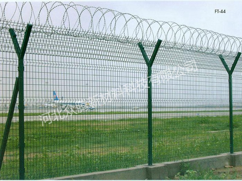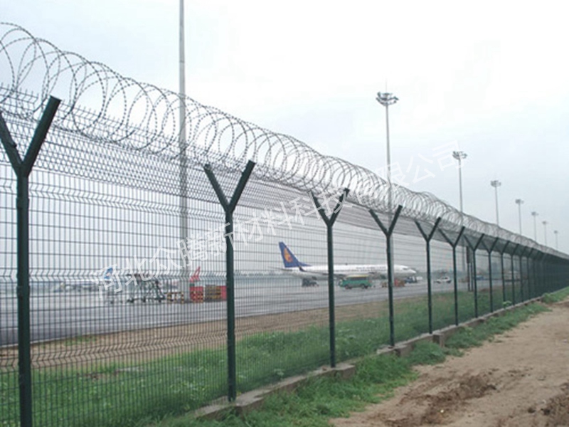 機場圍界又稱作“Y型安全防御護網”,是由V型支架立柱,加強型焊接片網,安全防盜連接件和熱鍍鋅刀片刺籠組成,安全性高、防攀爬能力好